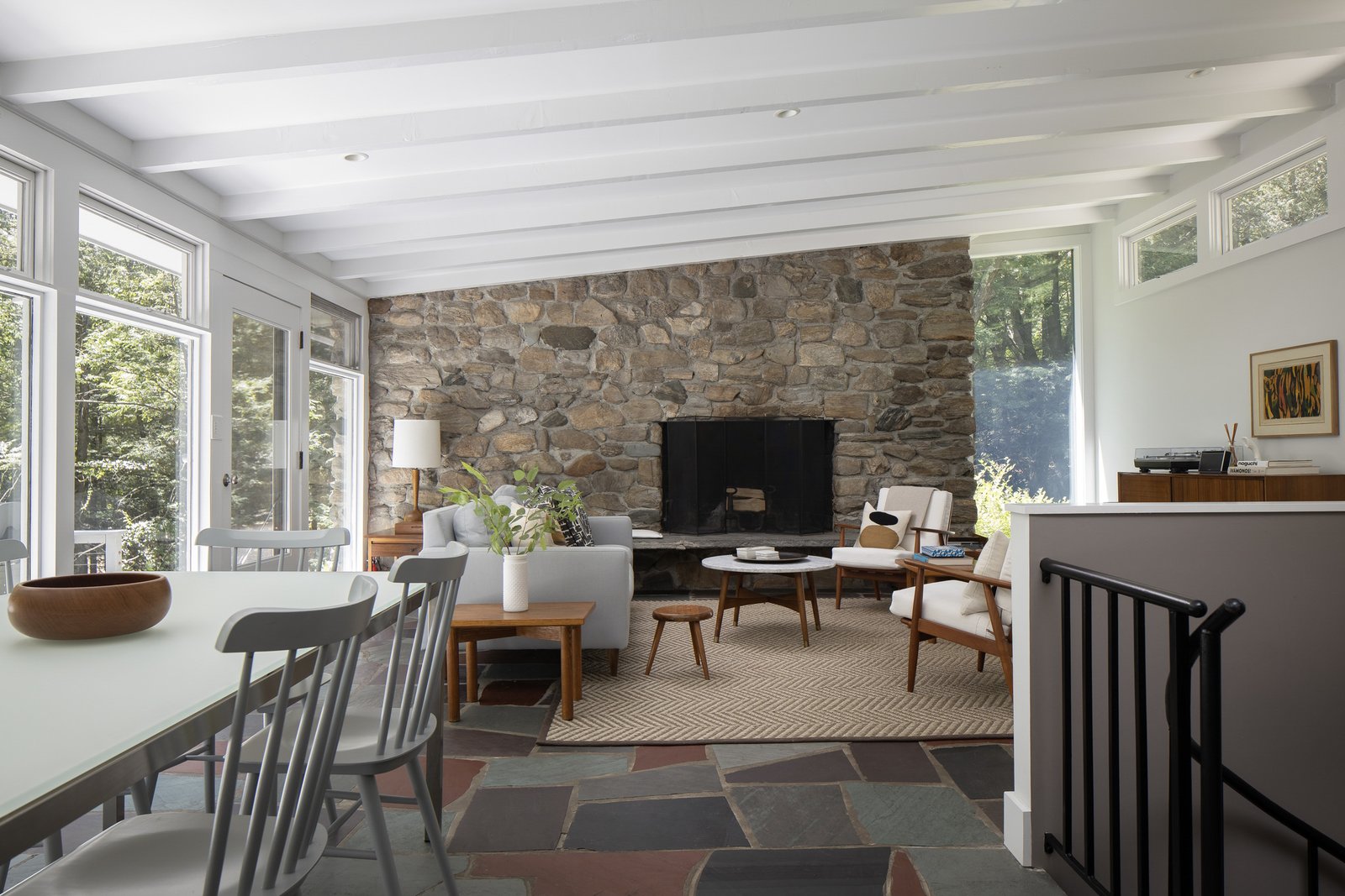 Stone Fireplace Between Windows - Photo 2 Of 15 In For 1 35m Snag This Renovated Midcentury Retreat Nestled In A Hardwood Forest Dwell