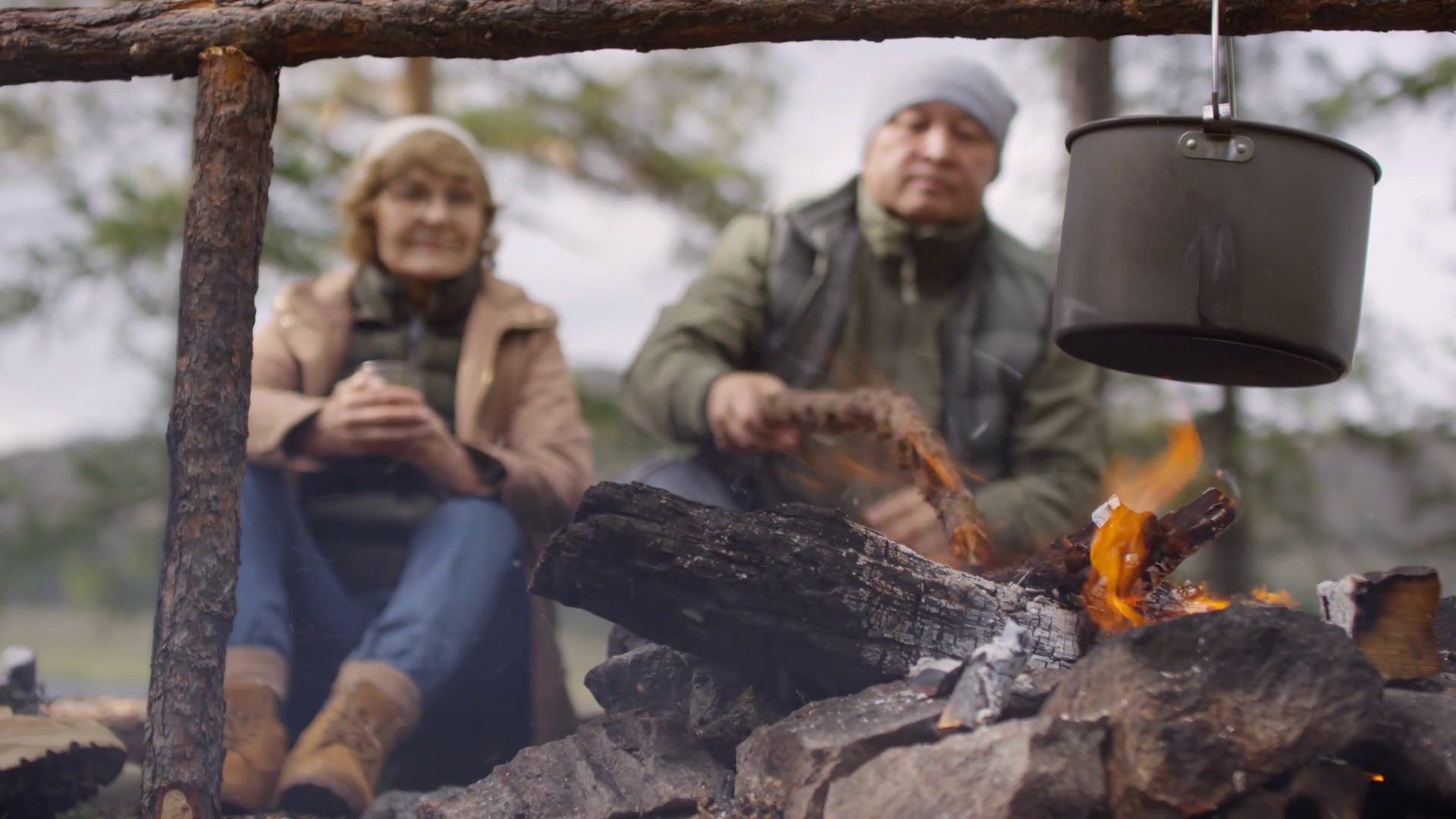 Logs Keep Burning - Close Up Shot Of Cast Iron Pot Over Campfire Senior Tourists Sitting In Background And Moving Logs Around With Wooden Stick To Keep Fire Burning Stock Video Footage Storyblocks