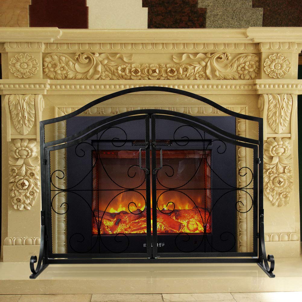 Gas Fireplace Child Safety Screens - Inno Stage Wrought Iron Fireplace Screen With 2 Doors Dark Black Large Decor Fire Place Panel Standing Gate With Mesh Cover For Baby Safe Spark Guard And Wood Burning Hearth Accessories Parts