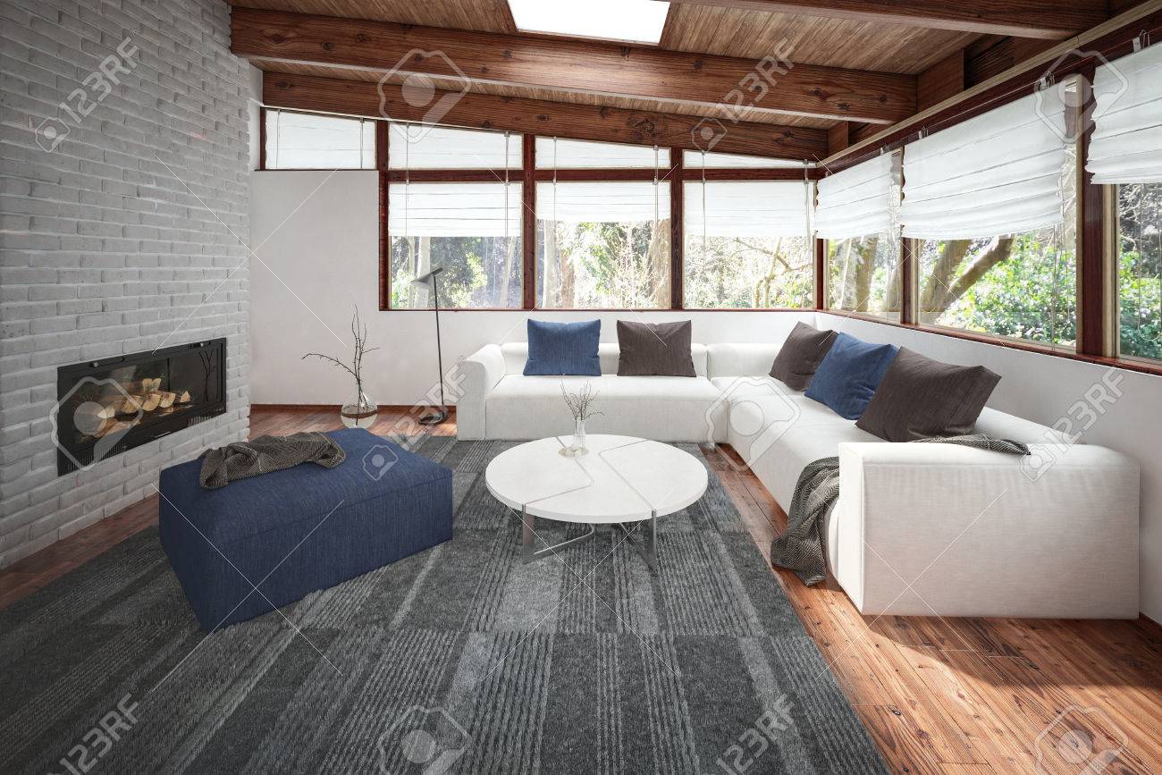 Living Room Fireplace Between Windows - Living Room With Wooden Floor And Ceiling Lots Of Windows And Stock Photo Picture And Royalty Free Image Image 70446826