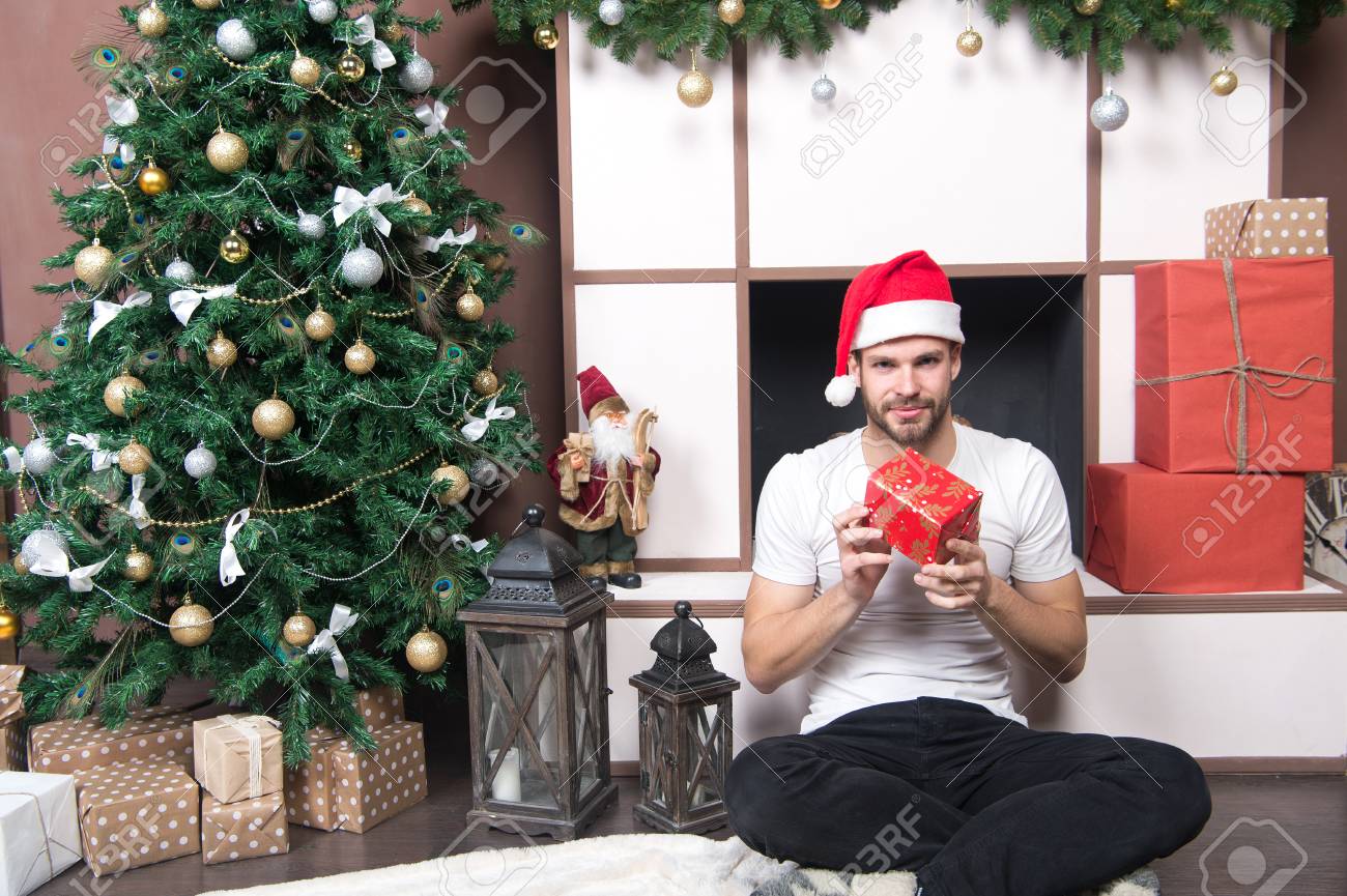Box Fireplace Christmas - Man In Santa Hat Sit At Fireplace Macho With Present Box At Stock Photo Picture And Royalty Free Image Image 92545518
