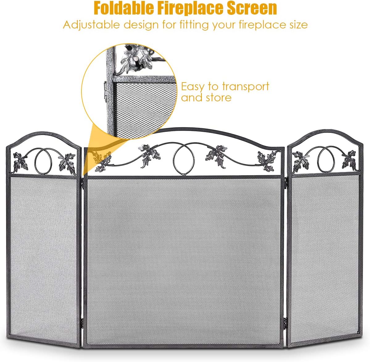 Coal Fireplace Screen - Costway 3 Pcs Folding Iron Fire Panel Grills Wide Metal Mesh Safety Fire Place Guard For Wood And Coal Firing Stoves Spark Flame Barrier With Leaves Decoration Spark Protection
